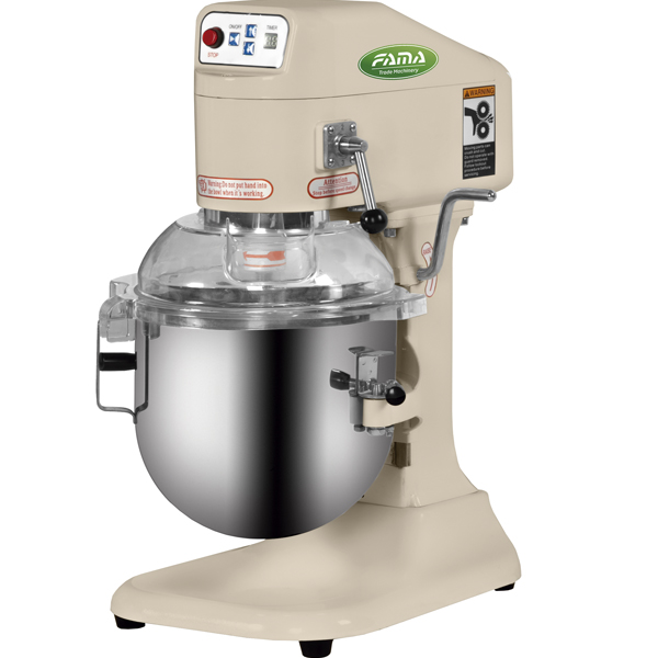 botón de parada. Cuba y batidor en acero inoxidable AISI 304. Gancho y espátula de aluminio.